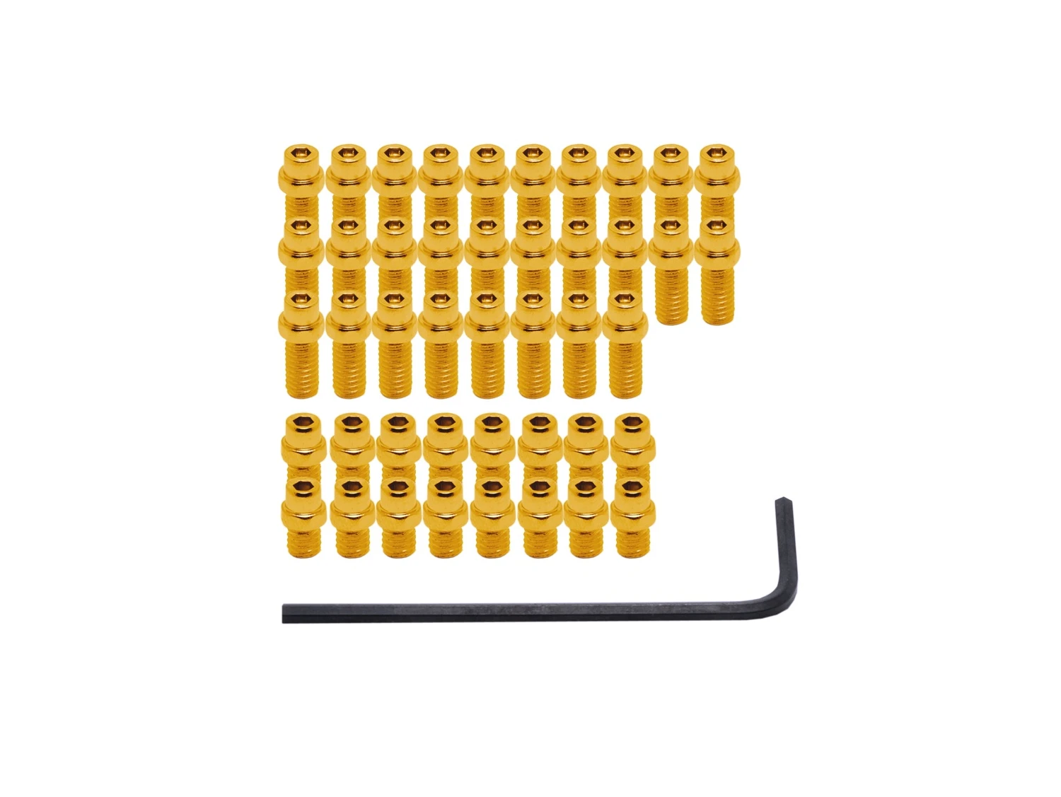 44 FlipPins en acier pour les pédales VAULT ! 16 x goupilles courtes (pour l’utilisation dans la partie centrale des pédales) longueur totale 8,5 mm, filetage M4x0.7×4. Et 28 x goupilles longues (pour l’utilisation dans le bord extérieur des pédales) longueur totale 12,5 mm, filetage M4x0.7×8. Clé hexagonale de 2 mm incluse.